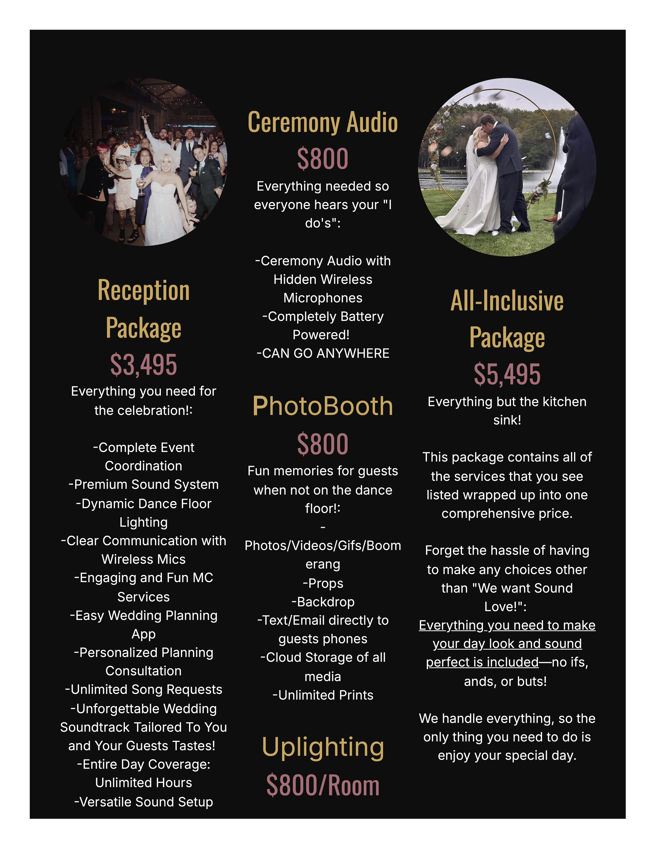 Our promise: A seamless, personalized experience that turns your wedding into a memorable celebration, focusing on fun, not fuss. We handle everything, so the only thing you need to do is enjoy your special day.
